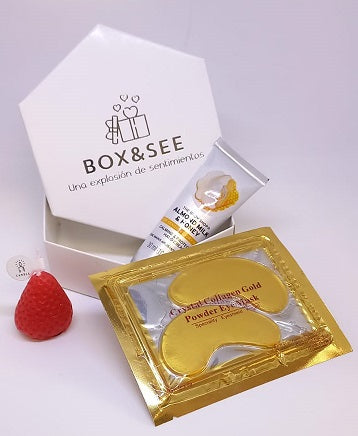 Dale un detalle saludable a tu ser querido que complemente el Box&See escogido. Con el kit consentido regalas una crema de leche de almendras y miel para el cuidado de las manos con una exquisita fragancia, además de un set de parches para las ojeras de colágeno de oro, una deliciosa vela aromatizada y 3 deliciosos chocolates Kisses, para endulzar tu linda sorpresa!